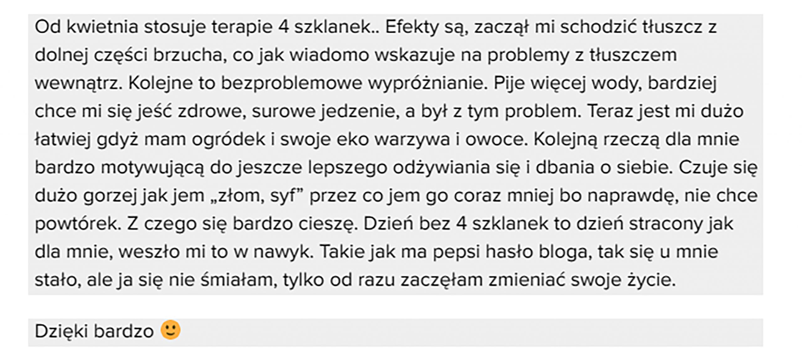 Jednak Ty nie musisz mnie naśladować. 4 szklanki stosujesz codziennie rano, zaraz po przebudzeniu.
