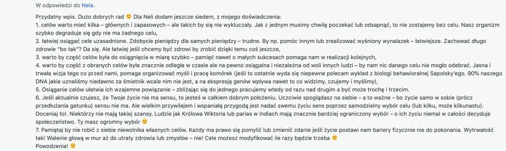 1. celów warto mieć kilka – głównych i zapasowych – ale takich by się nie wykluczały. Jak z jednym musimy chwilę poczekać lub odsapnąć, to nie zostajemy bez celu. Nasz organizm szybko degraduje się gdy nie ma żadnego celu,