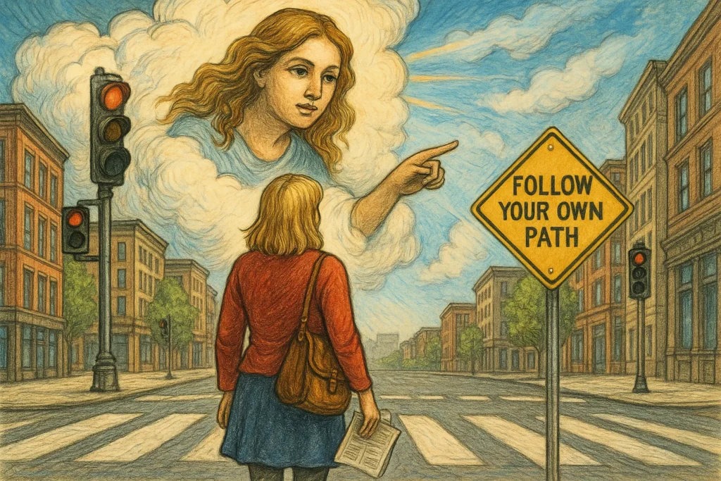 Stoi, raczej wrasta. Na duchowym (i realistycznie materialnym w 3D też), skrzyżowaniu. Jedna noga w afirmacjach, druga w panice, że ZUS.