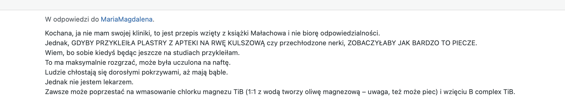 Jednak ostatnio coś „nie wypaliło” – ktoś z mojej rodziny zastosował wspomnianą na początku tego artykułu metodę Małachowa jak pozbyć się rwy kulszowej. Po 15 minutach od założenia woreczka z przetartym burakiem zmieszanym z kilkoma kroplami nafty osoba ta poczuła straszne pieczenie, jakby ktoś polewał ją wrzątkiem. Zdjęła natychmiast ten kompres (owinęła się folią, żeby nie pobrudzić burakiem pościeli) i musiała posmarować mocno zaczerwienioną skórę jakąś maścią leczniczą. Ból na szczęście dość szybko zelżał. Więc mam pytanie, czy to jest dokładny opis tej metody, może tej nafty trzeba mniej? Może nie trzeba zakładać folii? Wiem skądinąd, że Małachow to wielki znawca medycyny niekonwencjonalnej. Będę wdzięczna za jakieś informacje. Pozdrawiam serdecznie. MariaMagdalena