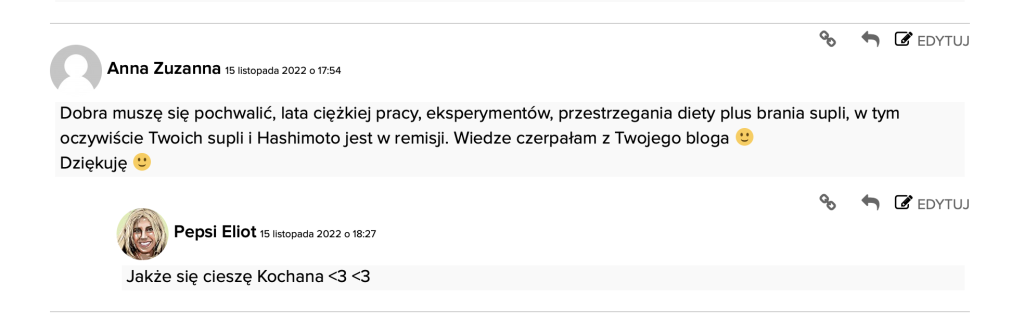 3 lata temu zdiagnozowane hashi, tsh wtedy powyżej 6 (norma do 4 z hakiem), wyszedł w usg stan zapalny tarczycy, anty tg prawie 4 razy przekroczona norma. Od tamtego czasu bezglutenowo, bezmlecznie, od 2 lat praktycznie ciągle z niewielkimi przerwami biorę G&F (1 dziennie), dawki przez Ciebie ustalone D3 z K2 (ostatnio miałam poziom ok.j 50, startowałam od 17), od roku B complex G&G, B12 Twoja ( przestałam jeść mięso ok 2 lata temu), okresowo maca, ashwagandha, stale chlorella i ostatnio spirulina (chyba ona mi wreszcie podniosła żelazo (niska norma), choć ferrytyna nadal za mała…), codziennie zielenina. Oczywiście wit.c, msm, selen. jod przez skórę, magnez cytrynian G&G i oliwka. Ogólnie cały czas siedzę na Twoim blogu, a Pan Radek ze stoiska w M1 to chyba już mnie po głosie rozpoznaje przez telefon;)