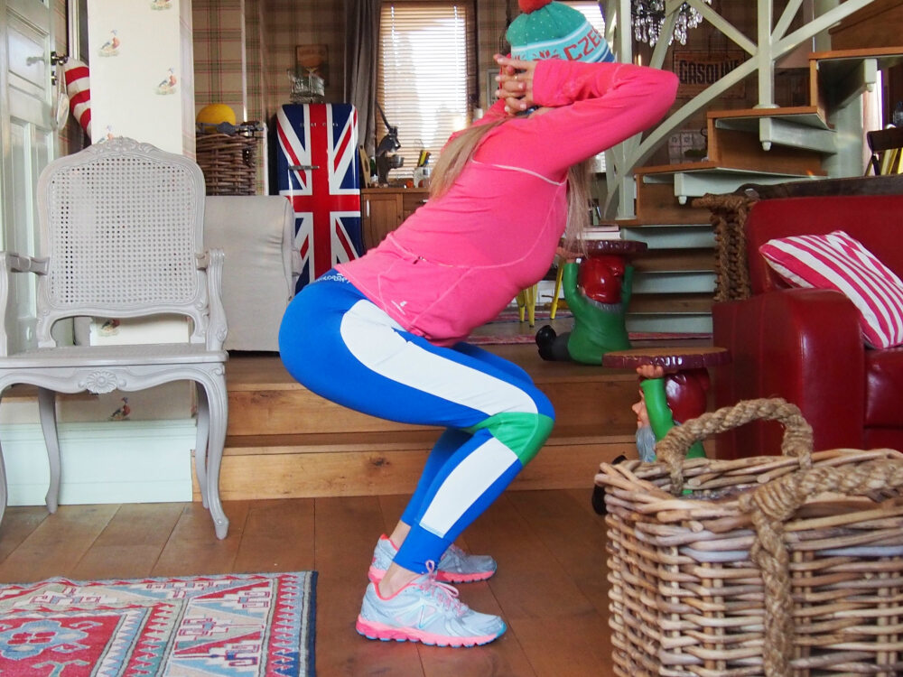 Do pozycji krzesełka, najlepiej ręce założone za głowę.