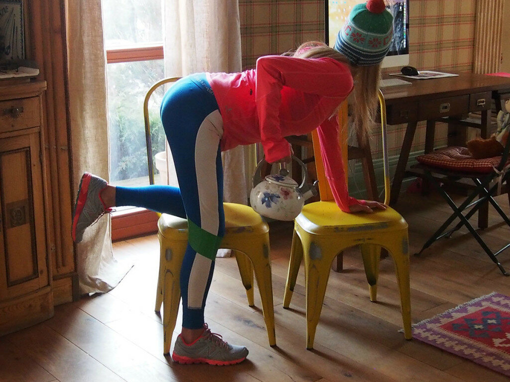 10 ćwiczeń na ławeczce (2 krzesła obok siebie) na triceps z obciążeniem (na przykład czajnik/kettlebell, ciężarek/hantla, lub po prostu kanisterek z wodą, lub płynem do prania, ma się rozumieć eco).
