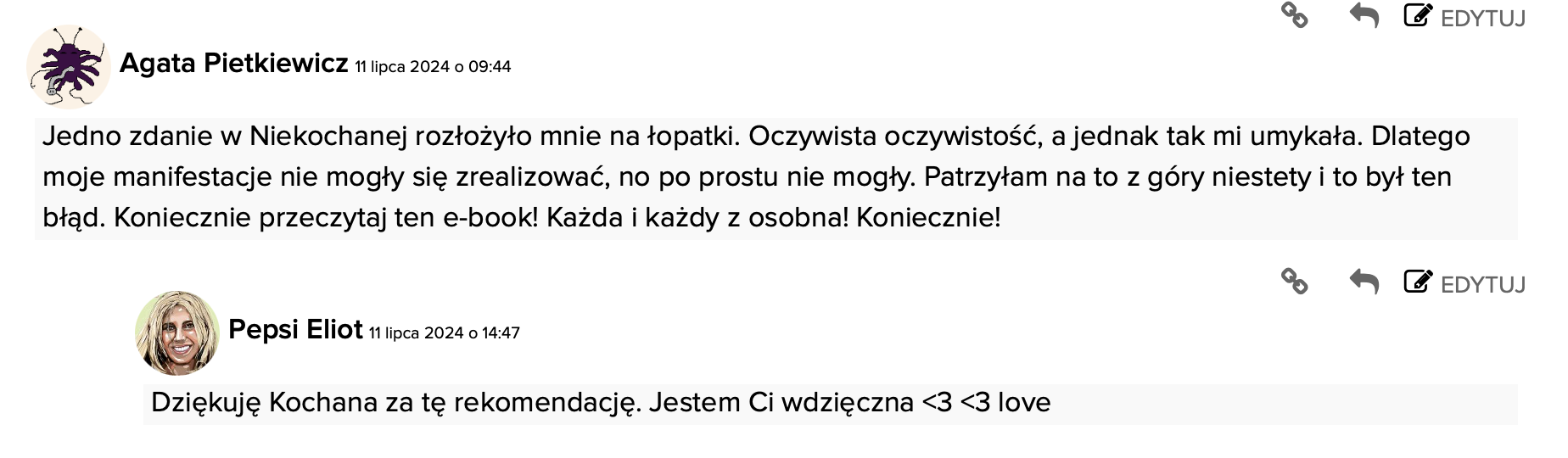 Jedno zdanie w Niekochanej rozłożyło mnie na łopatki. Oczywista oczywistość, a jednak tak mi umykała. Dlatego moje manifestacje nie mogły się zrealizować, no po prostu nie mogły. Patrzyłam na to z góry niestety i to był ten błąd. Koniecznie przeczytaj ten e-book! Każda i każdy z osobna! Koniecznie!