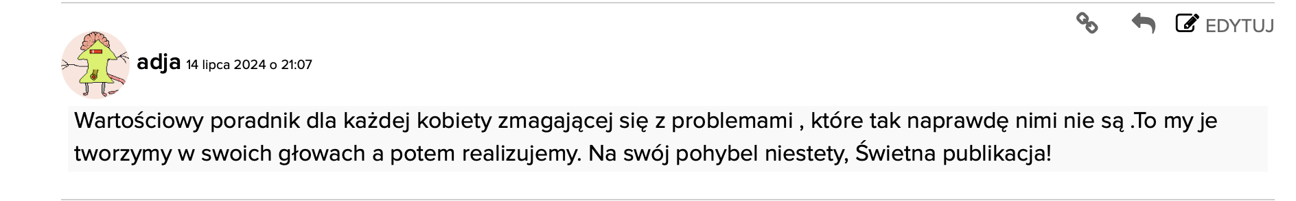 Wartościowy poradnik dla każdej kobiety zmagającej się z problemami , które tak naprawdę nimi nie są .To my je tworzymy w swoich głowach a potem realizujemy. Na swój pohybel niestety, Świetna publikacja!