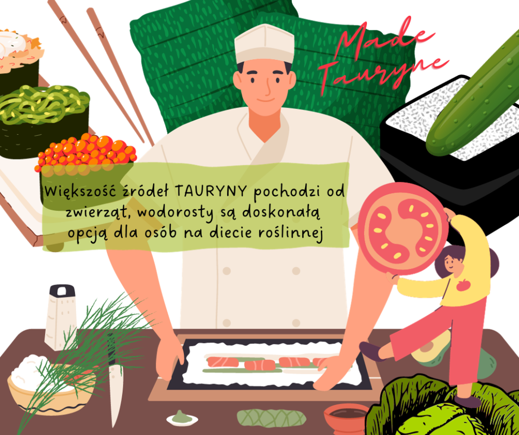 Nori, papierowy produkt z wodorostów używany do zwijania rolek sushi, zawiera aż 1300 miligramów tauryny na 100 gramów.