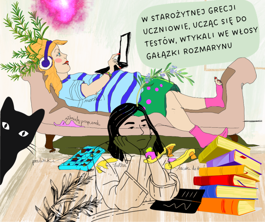Na przykład w starożytnej Grecji UCZNIOWIE, UCZĄC SIĘ DO TESTÓW, wtykali we włosy gałązki rozmarynu.